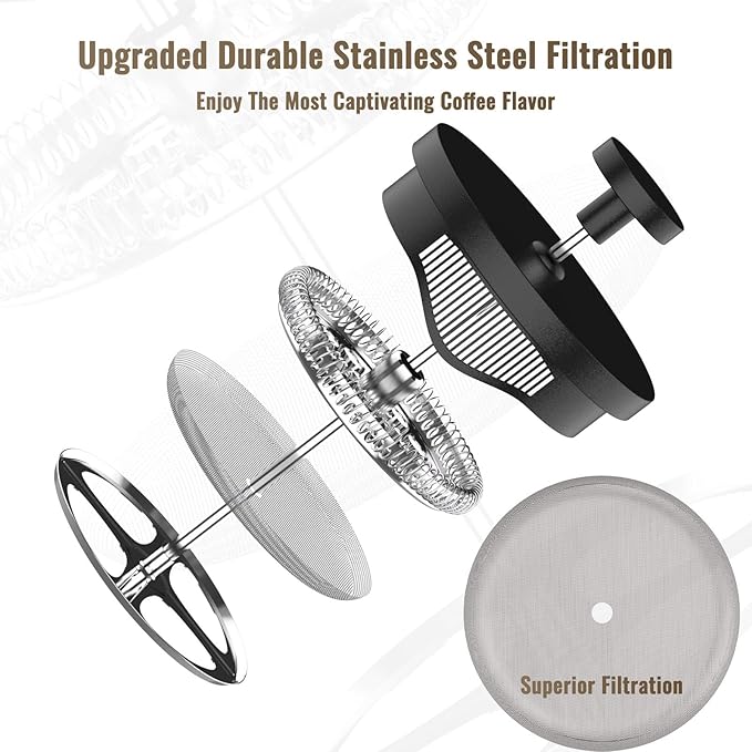- Easy to Use and Clean: Glass carafe can be easily cleaning, and certain parts such as the plunger and filter are dishwasher safe, making maintenance hassle-free.