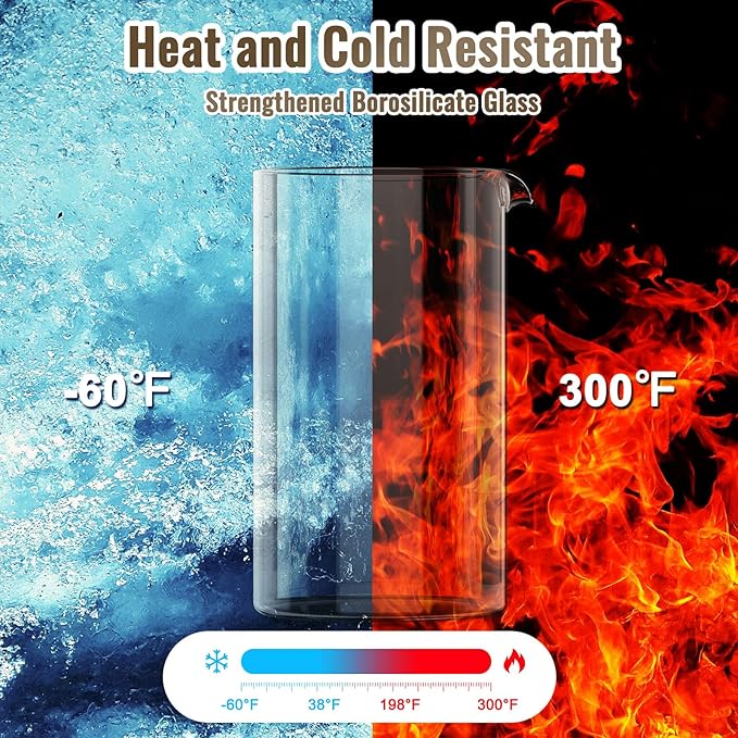 - Durable Materials: Made of heat-resistant borosilicate glass, high-quality 304 stainless steel, plastic, ensuring rust and corrosion prevention, anti-deformation, and long-lasting use. And the BPA Free plastic on the grip prevents burns.