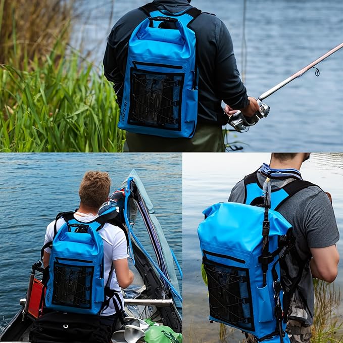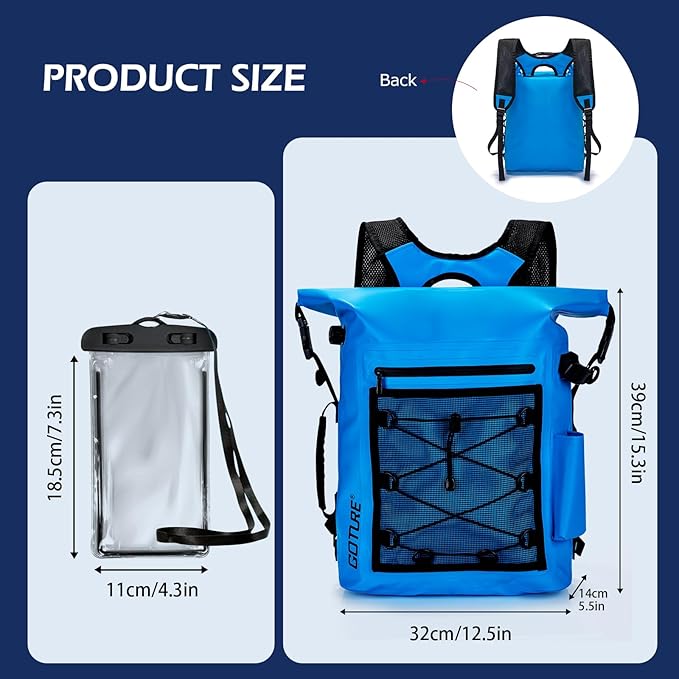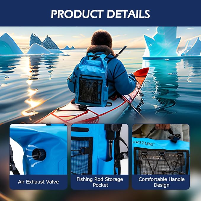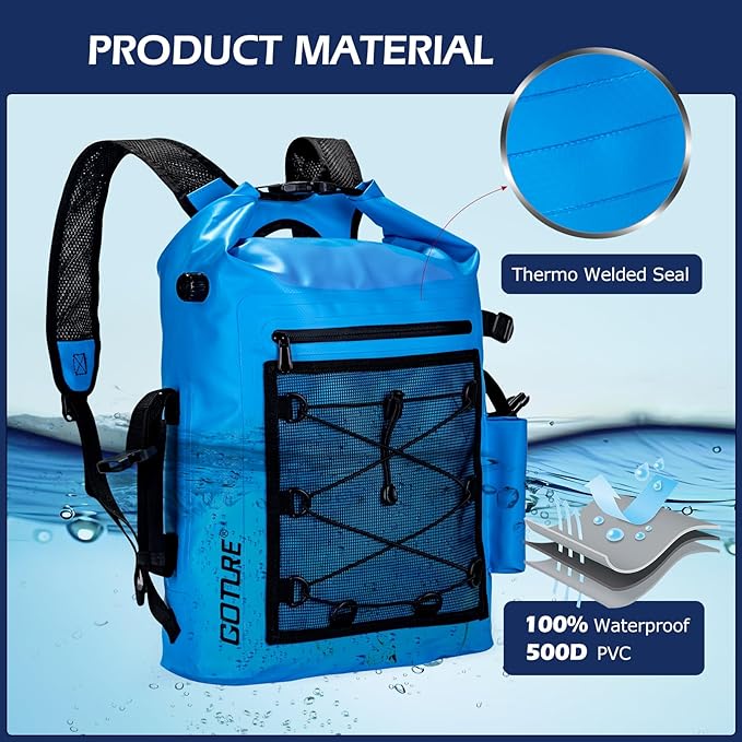 - 500D PVC Waterproof Bag: Goture dry bag backpack is constructed from heavy-duty 500D PVC, ensuring strong waterproof, dust-proof, and tear-proof performance. This dry bag protects your gear from rain, snow, dirt, dust, or sand. Perfect for various activities such as kayaking, fishing, camping, and rafting, it adapts to all weather conditions, offering durability and safety