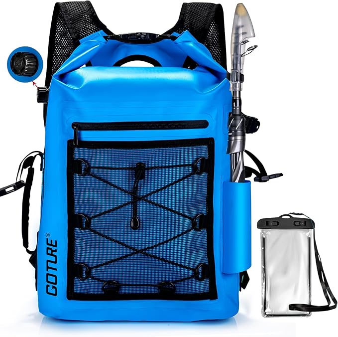 Goture Dry Bag Waterproof Backpack,20L Fishing Tackle Bag with Rod Holder,Padded Shoulder Straps and Air Exhaust Valve,500D PVC Dry Sack Bag with Phone Case for Kayaking,Boating,Fishing,Travel