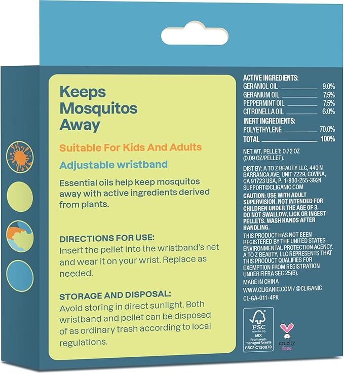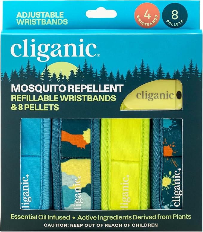 Cliganic Mosquito Repellent Pack (4 Wristbands + 8 Refill Pellets) - Adjustable, Natural DEET-Free, Essential Oil Infused