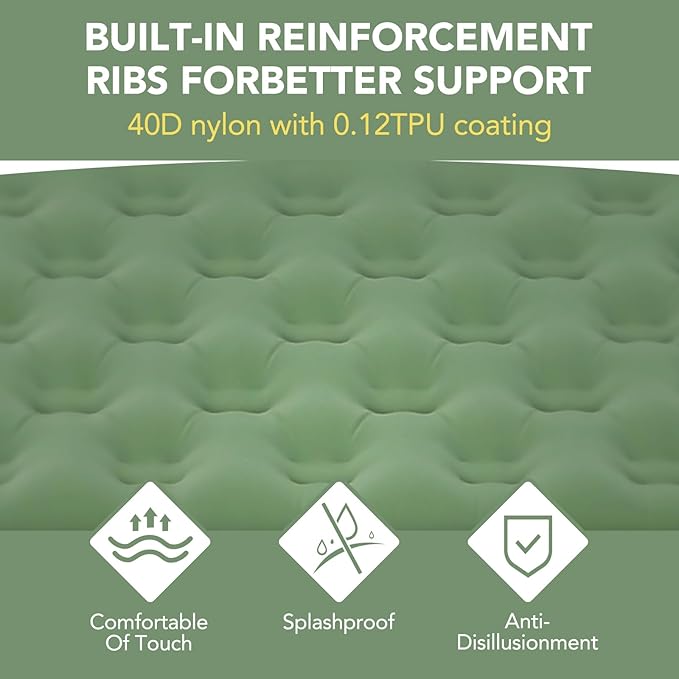 - 【40D nylon polyester & multi-layer TPU】:This camping bed mat is made of ultra-tough 40D nylon and inner waterproof TPU sealing coating, keeping you warm off the ground and keeping you from lying on the cold or rocky ground. the soft and cozy flocked top with a nice touch, keeping quiet when rolled over no squeaking for a comfortable night's sleep under the stars.