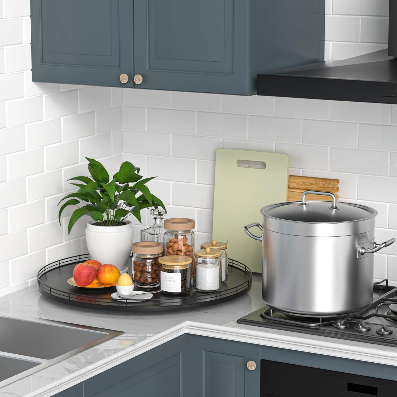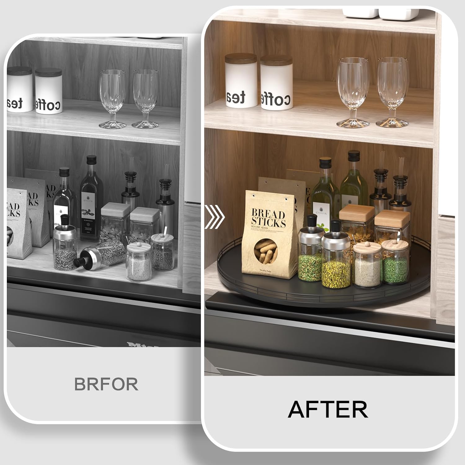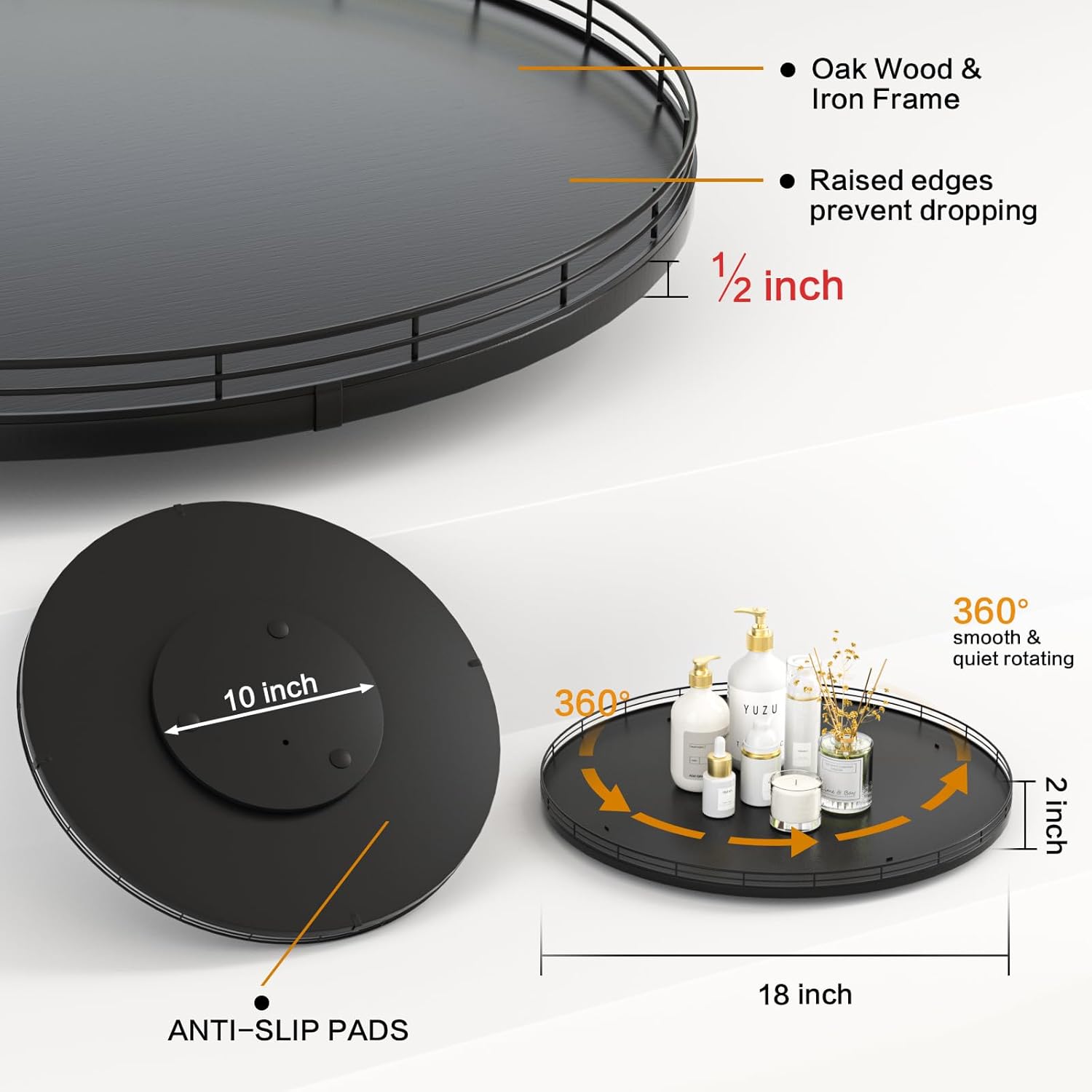 - 𝗧𝗵𝗼𝘂𝗴𝗵𝘁𝗳𝘂𝗹 𝗗𝗲𝘀𝗶𝗴𝗻: The turntable tray features a smooth and silent 360°rotation; Bottom slip-resistant pads for stability and protect your countertop from scratches; Raised edges on each organizer tray to keep items from falling out; Easy to use, no installation required