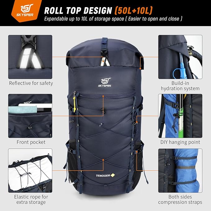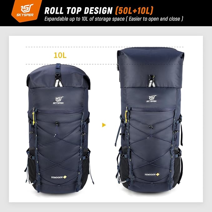 - ROLL TOP BACKPACK: The 50L backpack with roll top design, which can be adjusted for more or less items. It providing ample space to accommodate up to 60L worth of items. Whether it's a 2-people tent, sleeping pad, sleeping bag, boots, or clothes, you can easily pack them all in.