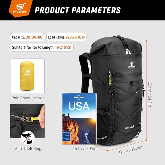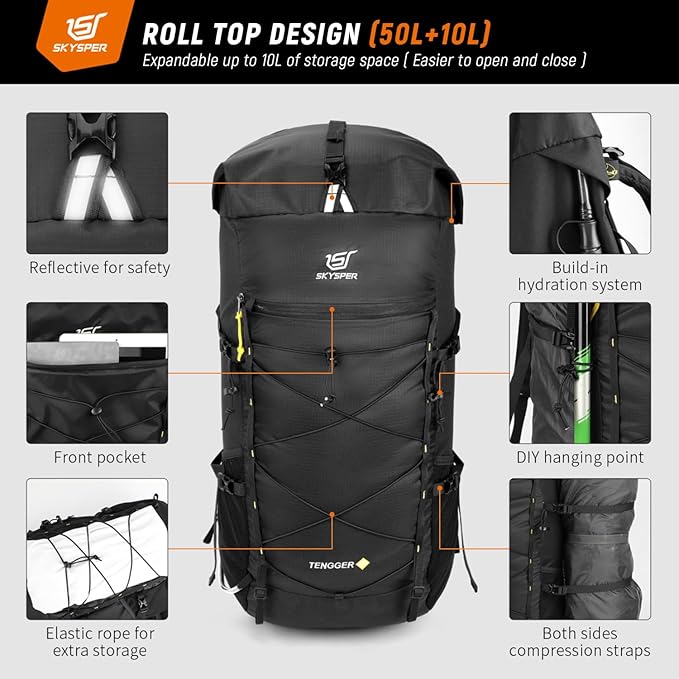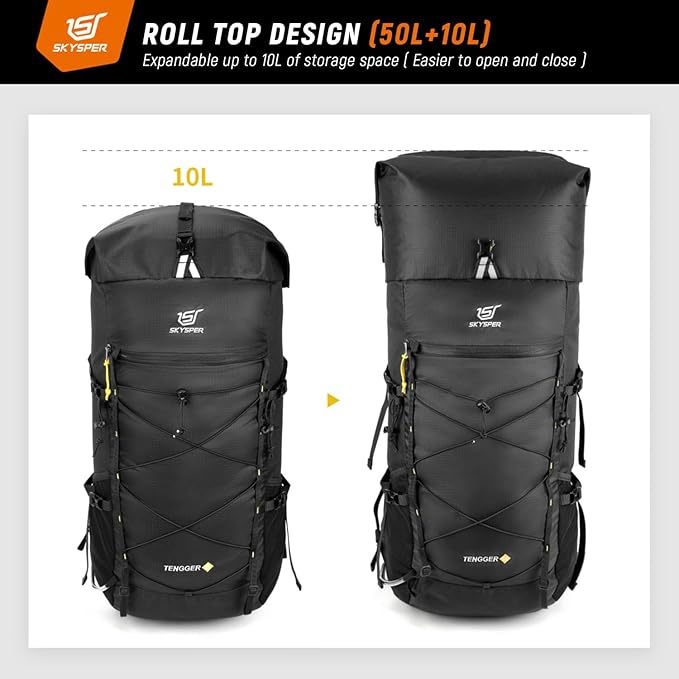 - ROLL TOP BACKPACK: The 50L backpack with roll top design, which can be adjusted for more or less items. It providing ample space to accommodate up to 60L worth of items. Whether it's a 2-people tent, sleeping pad, sleeping bag, boots, or clothes, you can easily pack them all in.