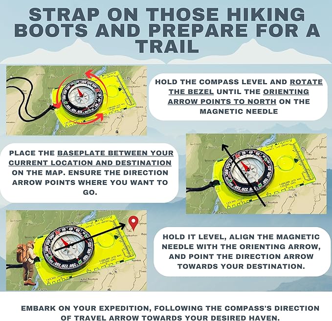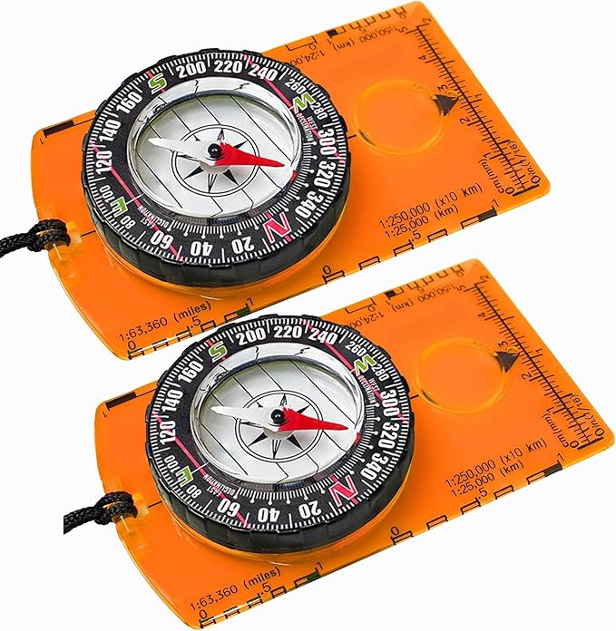 - IMPRESSIVE FEATURES: Both Compasses come with a non-magnetic Acrylic Baseplate to not intwith the magnetic needle, and have the best accuracy. The needle is placed in a bubble that allow the needle to have a quick 360 degrees rotation helping us to have a accurate and fast reading of the direccion the we have to take. Its differents Ruler Scales help the hiker to read the map more accurate. It also has a Magnifying Glass that help us to read geological maps and small details of the map.