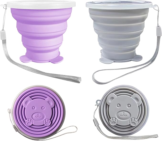 2 pcs 180ML Silicone Small Foldable Cup-Expandable Folding Drinking Cup -Reusable Portable Mugs Cup with Lids For Travel, Camping, Hiking, Survival, Holiday, Outdoor Sports Purple+Grey