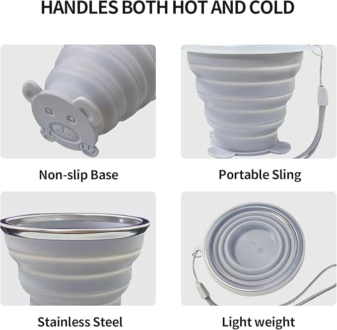- 🥛【Outstanding Design Mugs Cup】The bottom design makes collapsible cup easy to use and more stable when it is placed on a flat surface. The mouth of the mug cup is reinforced with a stainless steel rim, that doesn't collapse or flop around. The rope and portable hook let the cup could hang on your bag while you travel outside. Tight lid prevents any dust and dirt drop in your cup.