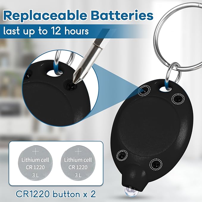 - Replaceable Batteries: Each keychain flashlight contains 2 CR1022 button batteries, which provide up to 12 hours of continuous use. The batteries can be easily removed and replaced when they run out.