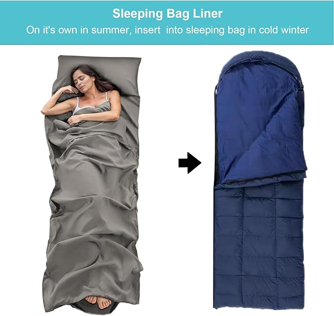 - VERSATILE DESIGN:This thermal sleeping bag liner fits inside a winter sleeping bag, letting you clean just the liner instead of the whole bag. It adds warmth for winter camping and can be used alone as a summer sleeping bag, perfect for all four seasons