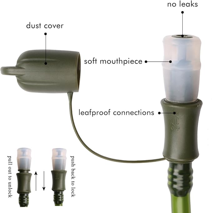 - Well-sealing water bladder: You won't be slowed down with our high flow bite-valve; simply bite the mouthpiece to suck water; soft mouthpiece with easily accessible ON/OFF valve; it also has a cover to keep dirt out; conveniently control the water flow by biting; quick-release tube is detachable; while the tube is removed, the connnector automatically shut off and the hydration bladder will stay filled; store neatly in fridge/icebox without tangling hose