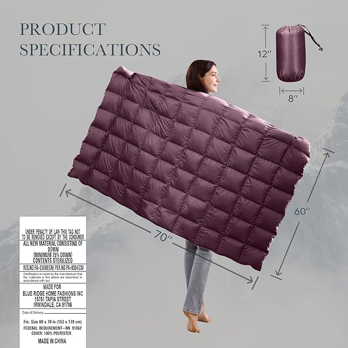 Blue Ridge Home Fashions Outdoor Down Throw Blanket for Camping Hiking - Packable Lightweight and Durable Blanket 60" x 70" with Carrying Pouch, 650 Fill Power Puffy Travel Picnic Beach Blanket