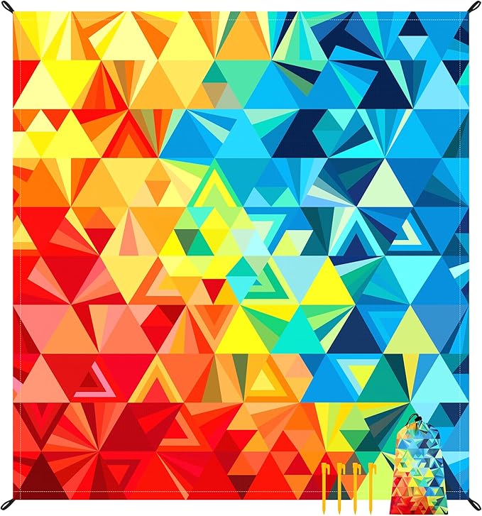 - Enjoy the Sun in Style - With its colorful triangle block design, the beach blanket stands out from the crowd. Each triangle boasts its unique hue, creating a gorgeous mosaic. Bold and vibrant colors range from the deep blue of the ocean to the fiery orange of the setting sun. Taking a moment to relax and rejuvenate in magnificent nature is possible with the SkyNature colorful beach blanket