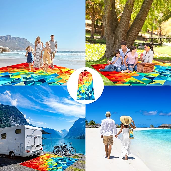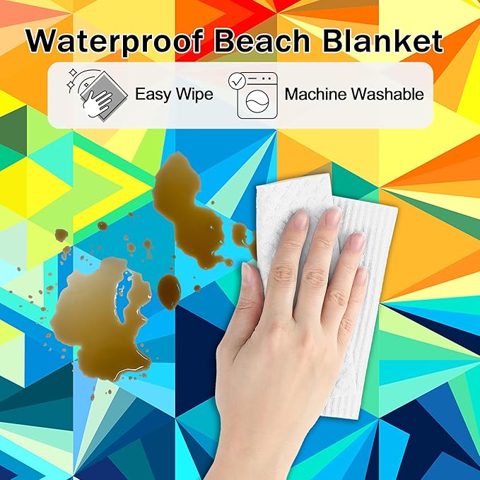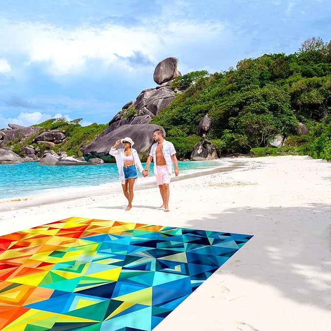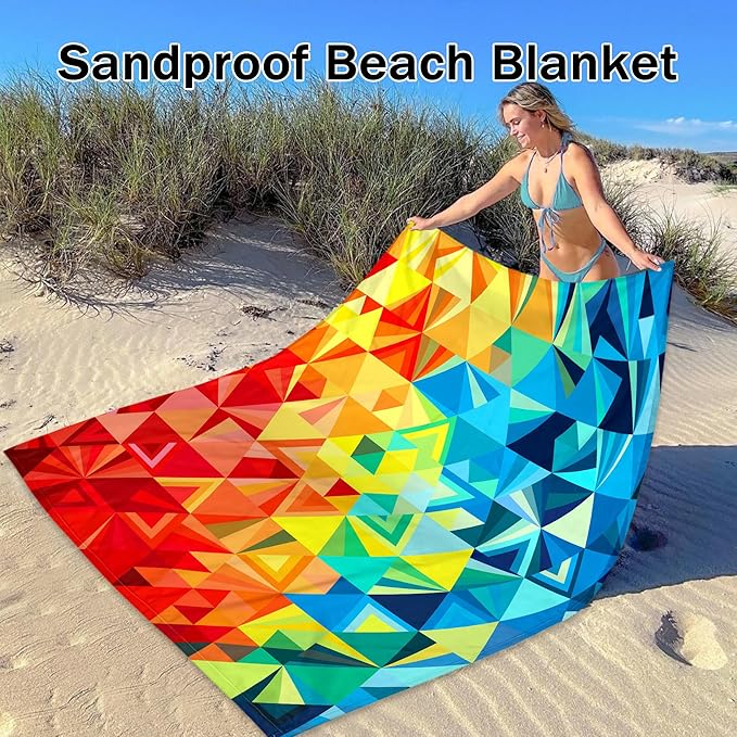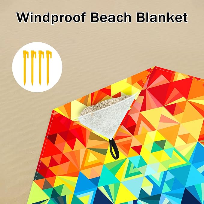 Colorful Beach Blanket Waterproof Sandproof, 78”x 86” Large Sand Free Beach Mat with Stakes & Portable Bag, Big Flodable Compact Outdoor Pockets Picnic Blanket for Festival, Camping - Triangle Blocks