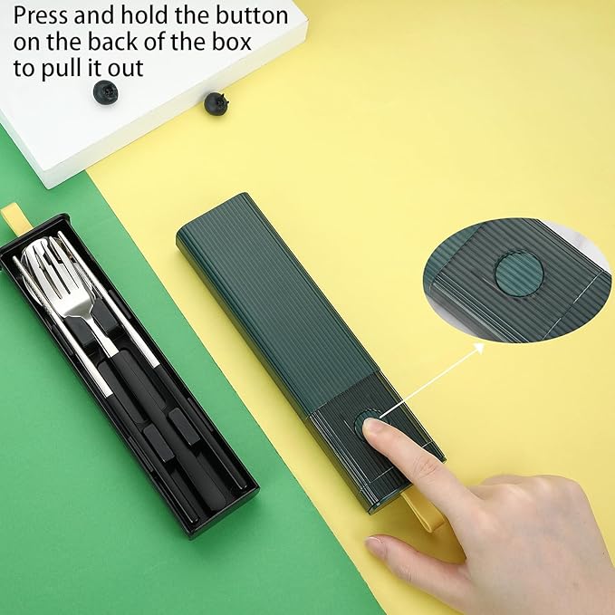 - Modern Design: This travel utensil set contains 1*fork-7.36 in, 1*spoon-7.36 in,1-pair chopsticks-7.2 in. More suitable for teens and adults. Mirror polished, no sharp edge. Removable silverware trough, reduce noise and easy to clean