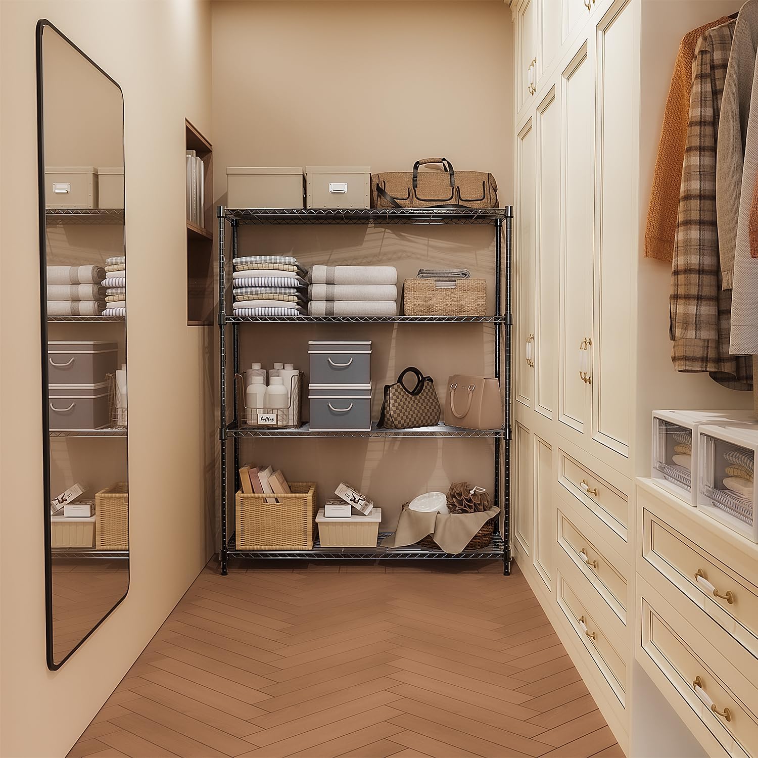 - HEAVY DUTY STORAGE SHELF: Our storage rack is made of sturdy high-quality carbon steel and 22.2mm metal rods and each shelving unit holds up to 350LBs on leveling feet, with a total bearing capacity of 1400 LBs.