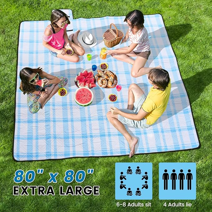 - 【80” x 80” Extra Large】The waterproof picnic blanket is an extra large outdoor blanket that measures 80" * 80" when unfolded. The picnic blankets waterproof foldable can allow 6-8 persons to sit on, or 4 persons to lie on. With its extra large size, the picnic mat is ideal for both family use and picnicking with several friends.