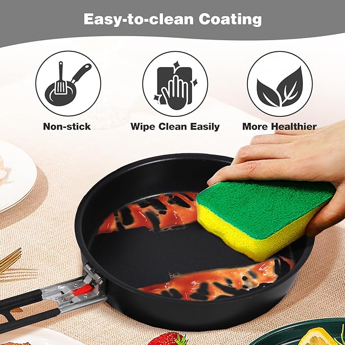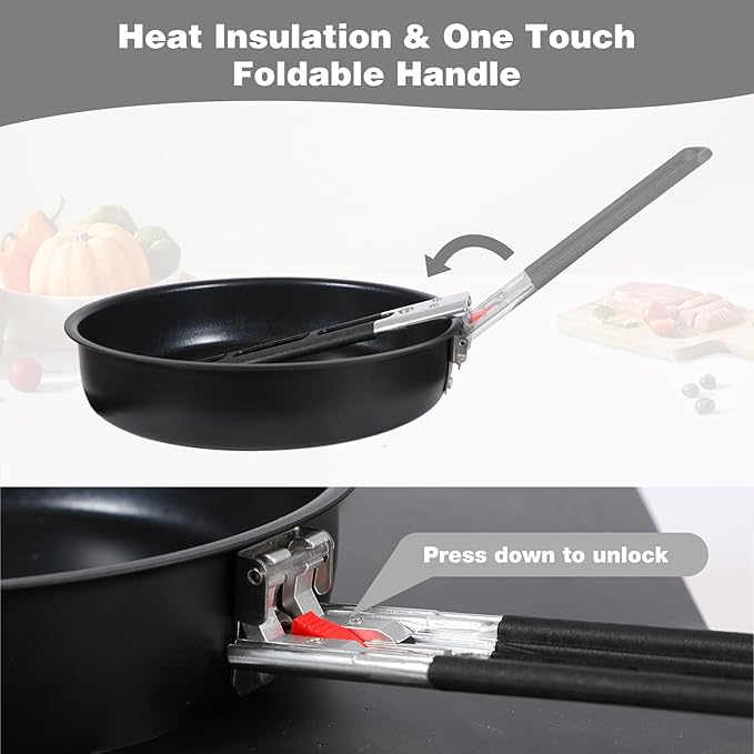 - High-quality and Easy to Clean Pan: REDCAMP aluminum pot and frying pan is easy to clean with damp cloth or cleaning sponge included. The pan has a handle which is thermally isolated so you don’t burn your hands. Please add food or water before heating. (Note: Better not run the cookware set through dishwasher. Hand wash only)