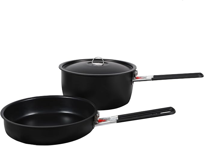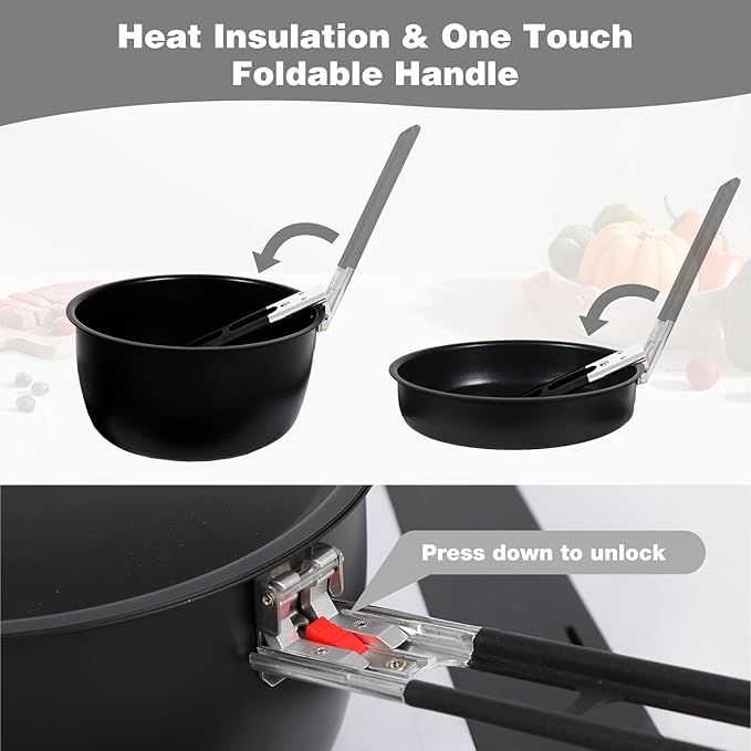 - Premium Quality and Non-stick Surface: REDCAMP aluminum pot and frying pan is easy to clean with a non-stick layer. Each piece has handles which are thermally isolated so you don’t burn your hands. Please add food or water before heating. (Note: Better not run the cookware set through dishwasher. Hand wash only)