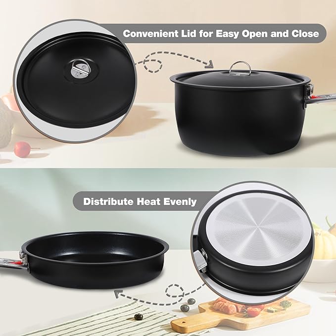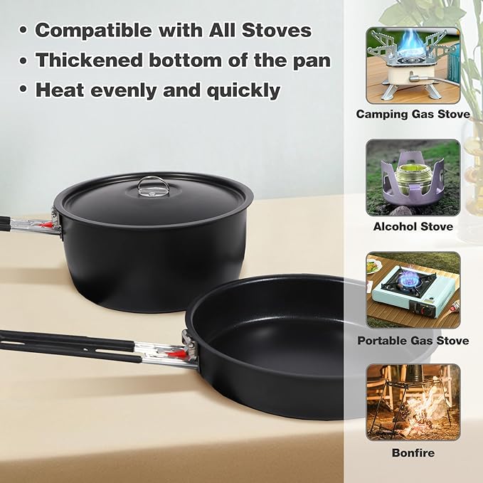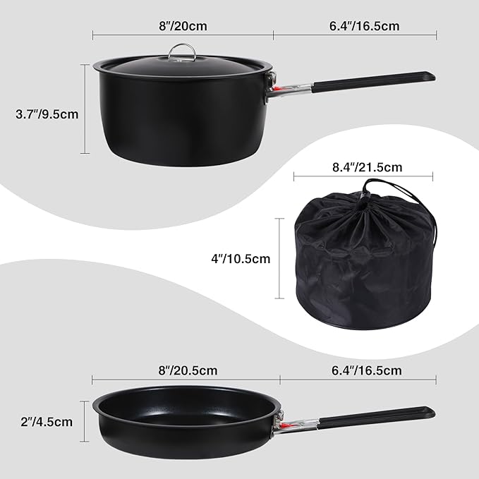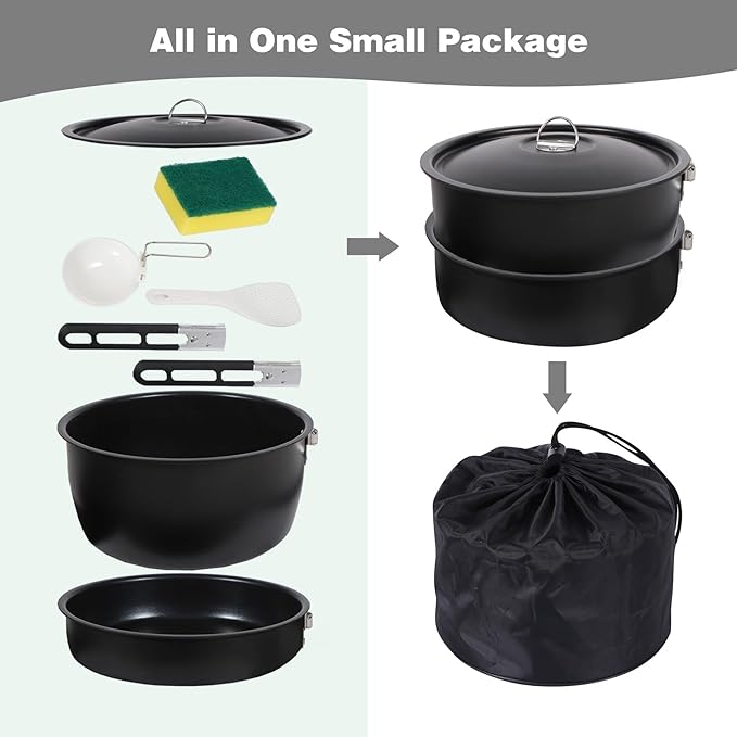 - Lightweight and Mini Size: REDCAMP camping cookware set weights 1.1lbs/0.5kg, this backpacking cookset is exceptionally lightweight so that your barely feel the weight within the pack on your back, and it take up little space.