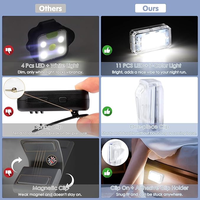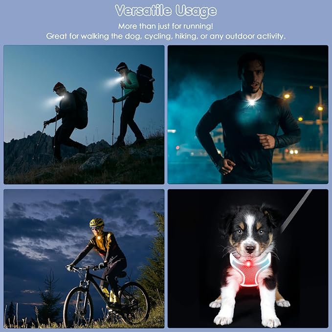 - Night Safety Light: Built-in 11 LED chips with 300 lumens of bright and soft light without blinding, our running lights for runners significantly enhances visibility in low-light conditions. This ensures that runners are noticed by pedestrians, cyclists, and drivers, thereby improving safety during nighttime outdoor activities.