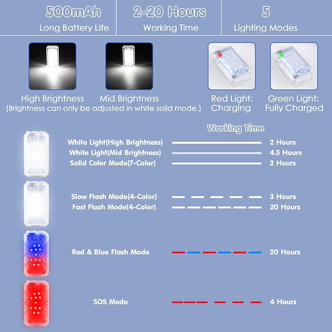 - Lots of Light Options & 500mAh Battery: 5 Light Modes: Solid Color / Fast Flash / Slow Flash / Red & Blue Flash / SOS Mode. Add a playful touch to your evening run and stand out in the dark with the 7-color running light for jogging. The running clip on flashlight has a battery life of 2-20 hours, depending on the mode. Flash mode lasts longer than solid mode, and white light can be dimmed to save battery power.