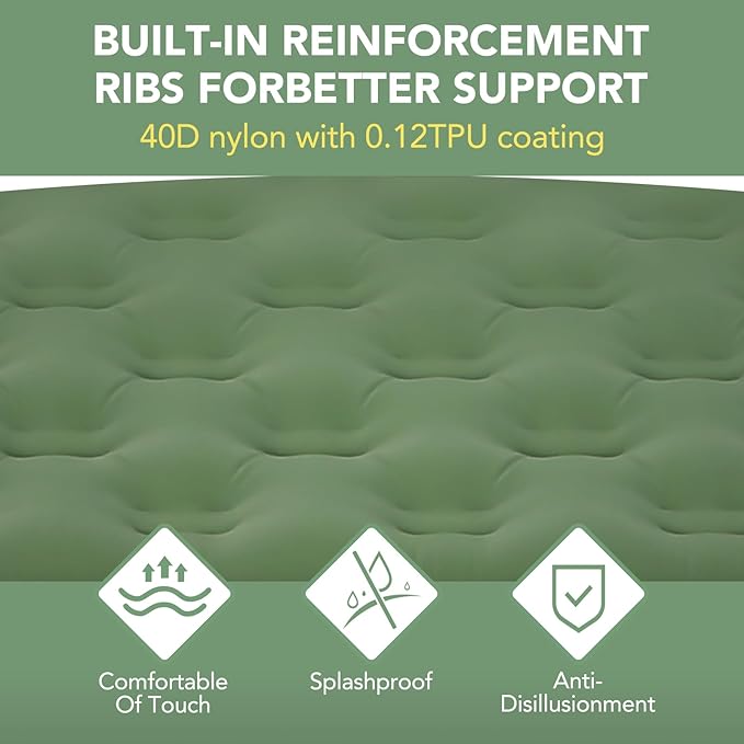 - 【40D nylon polyester & multi-layer TPU】:This camping bed mat is made of ultra-tough 40D nylon and inner waterproof TPU sealing coating, keeping you warm off the ground and keeping you from lying on the cold or rocky ground. the soft and cozy flocked top with a nice touch, keeping quiet when rolled over no squeaking for a comfortable night's sleep under the stars.