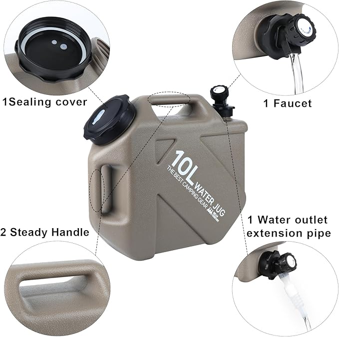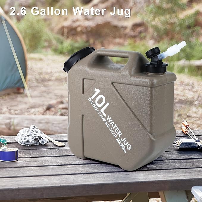 - ⛰️🚐🏕️Be prepared on your next outdoor trip with the Tohomes 2.6 Gallon (10L) Water Jug. This durable water jug is perfect for storing and carrying large amounts of water, ensuring you stay hydrated during hikes, camping trips, and RV adventures. With its leak-proof design, you can trust that your water supply is safe and secure.