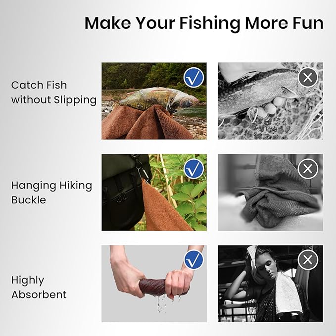 - 🎣【Compact yet versatile】: This towel is a must-have for fishing and outdoor activitiesby efficiently cleaning your hands, rod, reel and tools. You can wrap the fish in a towel and grab it. It is non-slip, protects the fish from injury, and avoids getting fishy smell on your hands. The 16"*16" size can meet the needs of various outdoor scenarios.