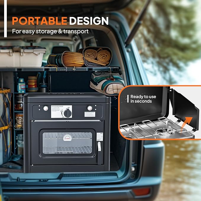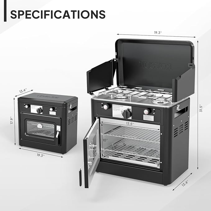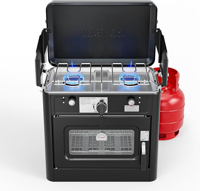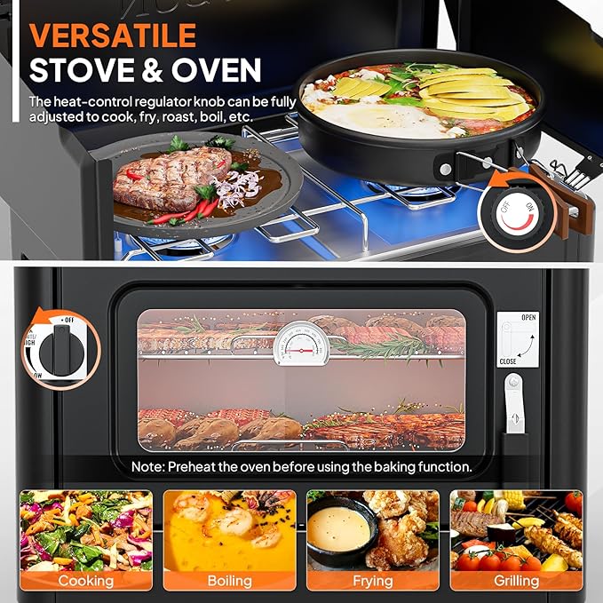 - 【Powerful Output】This powerful, portable two-in-one gas stove is equipped with two 8000 BTU high-performance stove burners and a 3800 BTU full-function oven, allowing you to enjoy home-like meals outdoors. Whether it's camping, hiking, or outdoor gatherings, this propane gas stove is your ideal tool for cooking delicious food