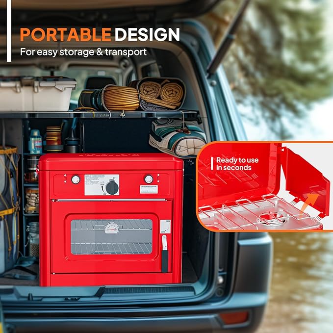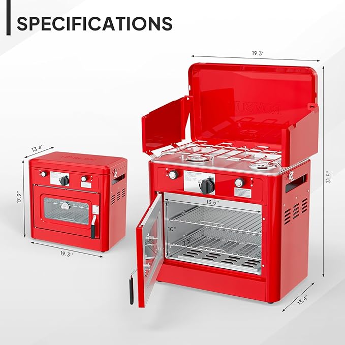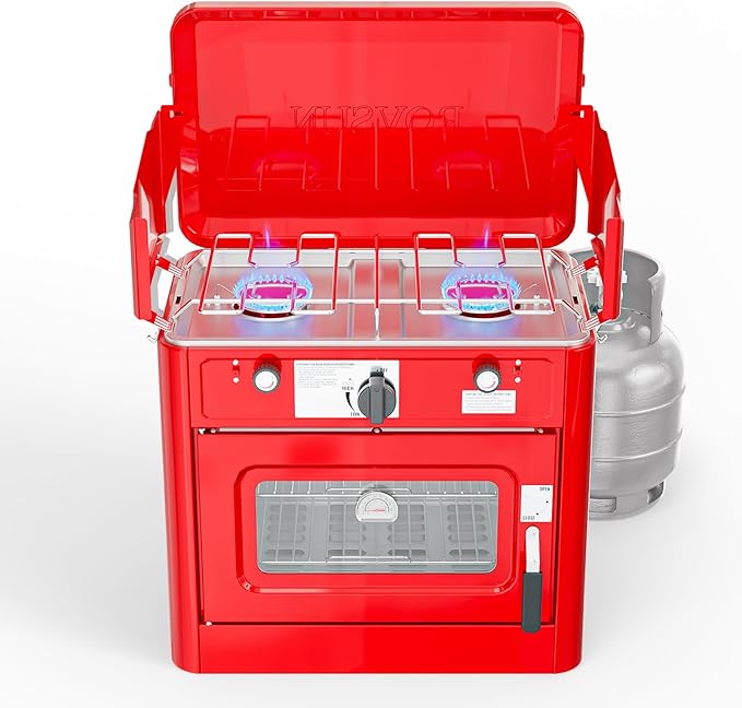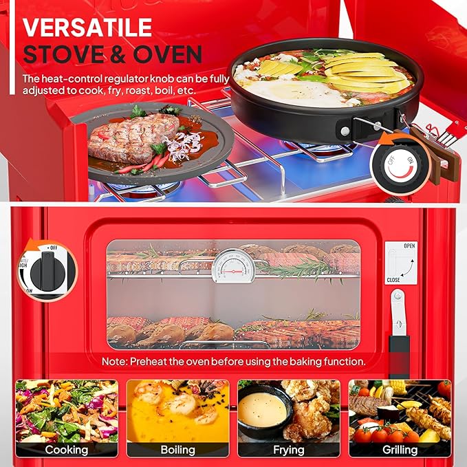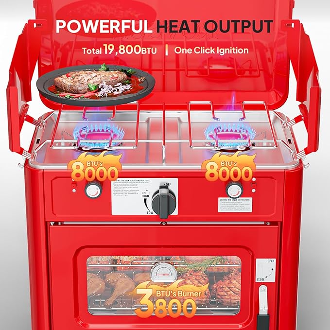 - 【Powerful Output】This powerful, portable two-in-one gas stove is equipped with two 8000 BTU high-performance stove burners and a 3800 BTU full-function oven, allowing you to enjoy home-like meals outdoors. Whether it's camping, hiking, or outdoor gatherings, this propane gas stove is your ideal tool for cooking delicious food