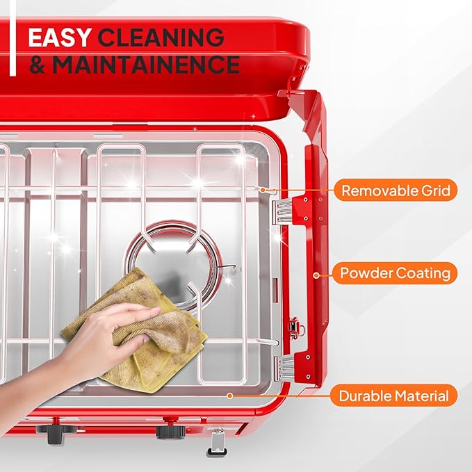 - 【Dual Burner Design】Whether it's boiling water, grilling meat, stir-frying vegetables, grilling hot dogs, or other everyday kitchen tasks, it can be easily accomplished, suitable for pans no larger than 10 inches. Equipped with a convenient push-button igniter and a temperature control knob that can adjust the firepower, and the detachable pot rack makes cleaning simple, providing you with a safe and convenient cooking experience