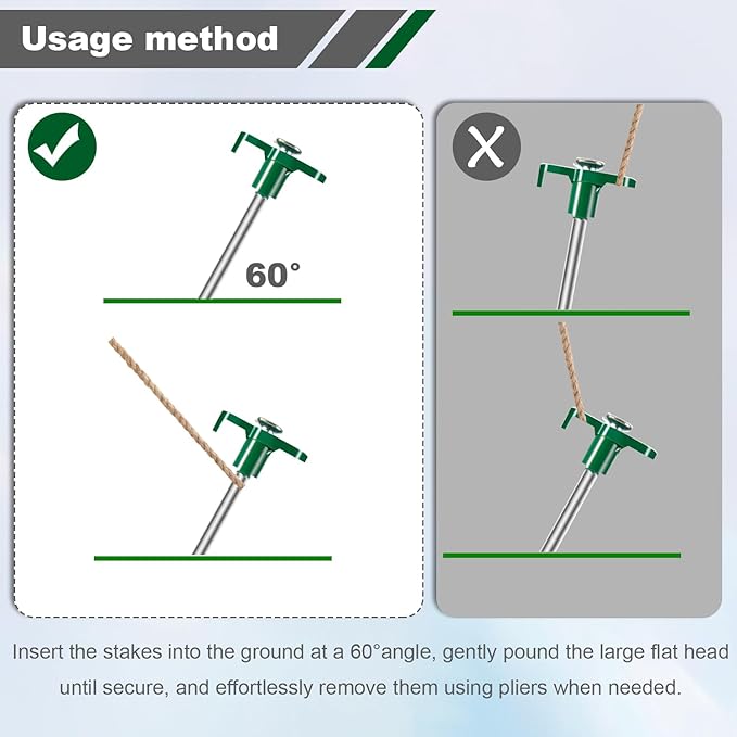 - 【Ease of Use and Removal】Insert the stakes into the ground at a 60° angle, gently pound the large flat head until secure, and effortlessly remove them using pliers when needed.