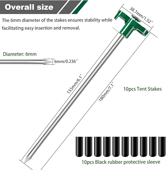 - 【Moderate Diameter Design】10PCS Green Tent Stakes;Diameter: 6mm;Length 18cm/7.1in;The 6mm diameter of the stakes ensures stability while facilitating easy insertion and removal.