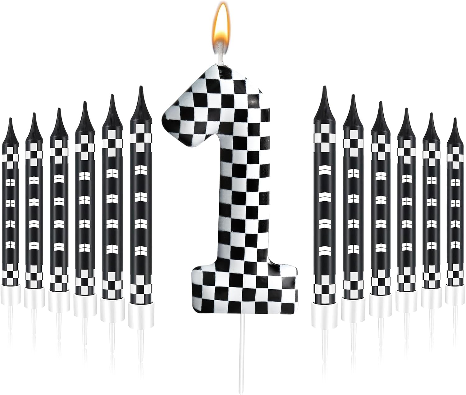 13 Pcs Racing Cars Themed Birthday Candles Black and White Race Number 1 Checkered Candle Cake Topper for Racing Car Party Decoration Supplies (Number 1)