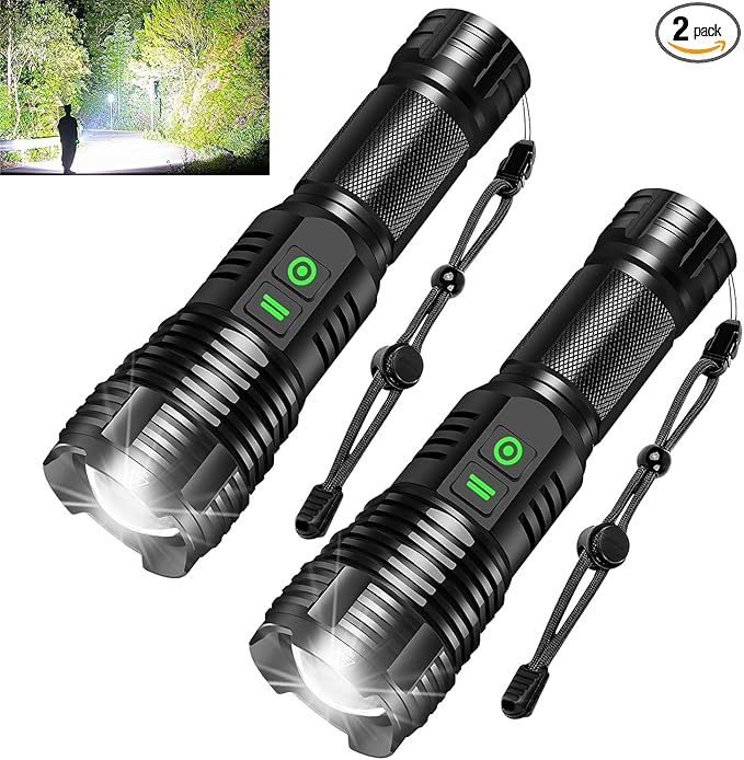 - 🔦【5 Lighting Modes & Telescopic Zoom】: Strong light, weak light, continuous flash, delayed flash, and use different lighting modes according to different situations. Led flashlight zoom in mode can illuminate half a mountain, and the zoom out mode can illuminate 3280 feet distance. Flashlights high lumens can provide super brightness in both outdoor and indoor. Powerful light gives you a full sense of security, making it ideal for daily use.