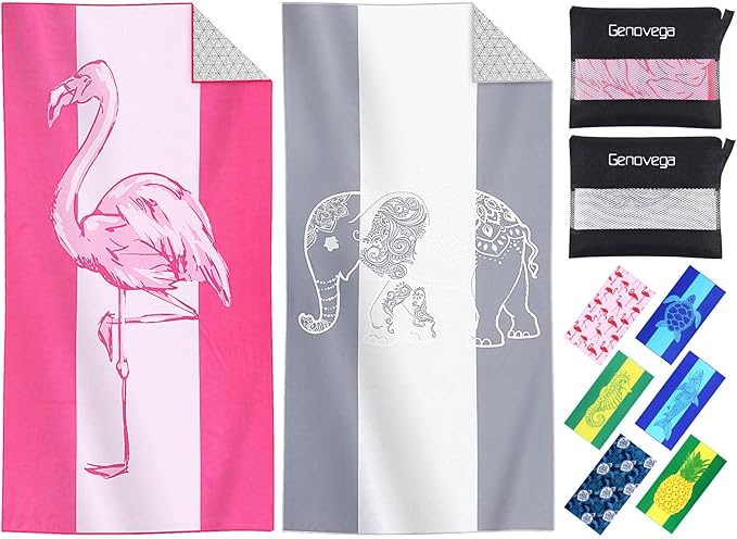 2 Packs Microfiber Oversized Lightweight Thin Beach Towel Compact Sandproof Quick Dry Clearance Towels Extra Large Sand Free Pool Travel Essentials Accessories Women Men Adults Gifts Elephant Flamingo