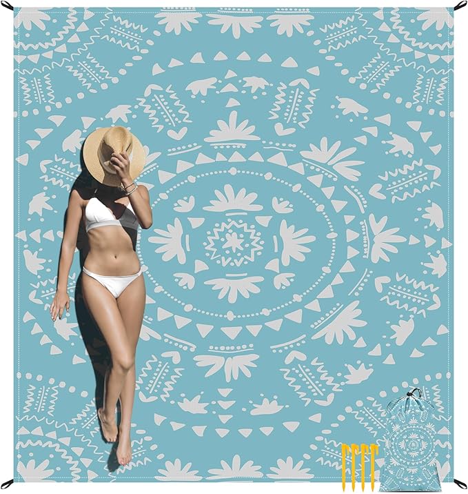 Bohemian Beach Blanket Waterproof Sandproof, 78”x 86” Large Sand Free Beach Mat with 4 Stakes & Portable Bag, Big Flodable Compact Outdoor Pockets Picnic Blanket for Festival, Camping - Boho Turquoise