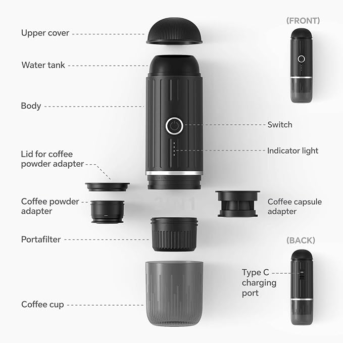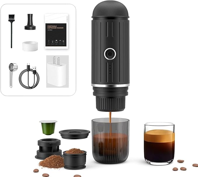 - ☕【ELECTRIC PORTABLE ESPRESSO MACHINE】 With rechargeable battery, fast heating, one-button extraction, no need to press manually. This rechargeable portable coffee machine is the best choice to enjoy up to 60ml of real espresso at home, in the office and on the go.