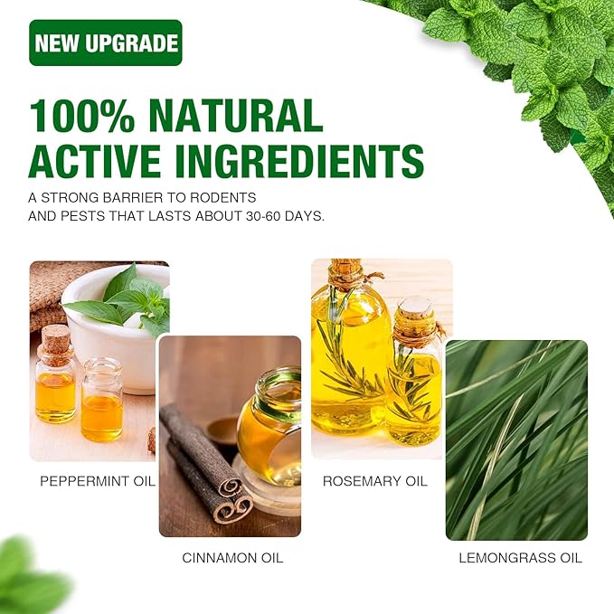 - Long-lasting Natural Formula: Crafted from castor oil, clove oil, and peppermint oil, these natural ingredients release a consistent peppermint scent for up to 3 months, effectively keeping mice away. Safe to use around humans, pets, gardens, and the environment.