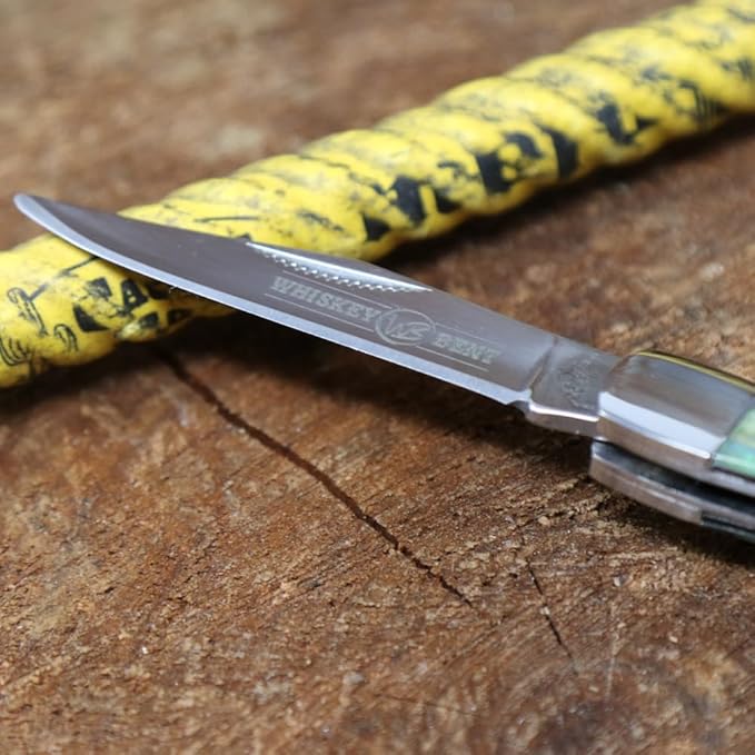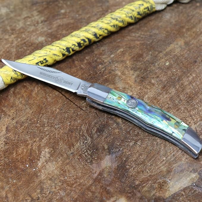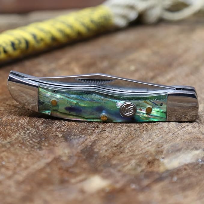 WHISKEY BENT HAT CO. Mini Hunter Folding Pocket Knife 2.75" Closed Length 440C Stainless Steel Blade (Green Abalone)