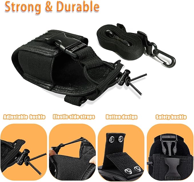 - High quality: Radio holder constructed by high quality and durable nylon material, elasticated cord secures the top of the walkie talkie and adjusts the pouch size to fit. elastic side webbing designed to hold different sized radios in place. 1” webbing sho