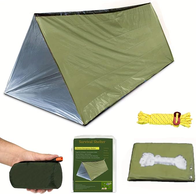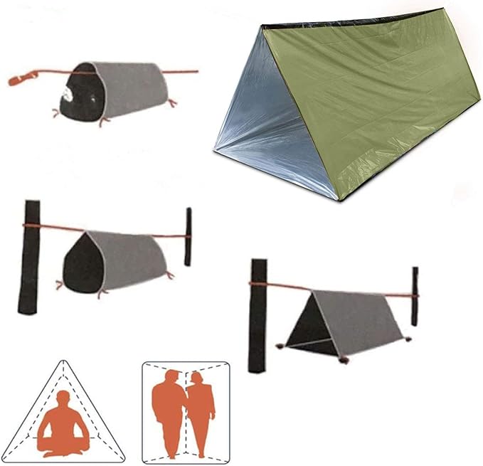 - 【Quick Installation】Simply thread a jump rope through the ends of the tube tent and tie it between two trees or a sturdy object 3-4 feet off the ground,Use rocks to secure the corners of the tent,If there are no trees around,emergency shelter can also be used as an emergency sleeping bag,emergency bib,space blanket.
