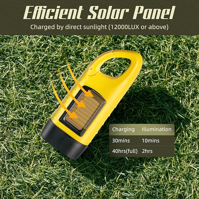 - Solar Powered: Equipped with a solar panel, the flashlight can charge itself by laying in the sun. Charging for 30 minutes in direct sunlight (12000LUX or above) delivers 10 minutes’ lighting. 40 hours’ charging in direct sunlight will fully charge the battery. Put it by the window facing the Sun, it will always be ready for your emergency!