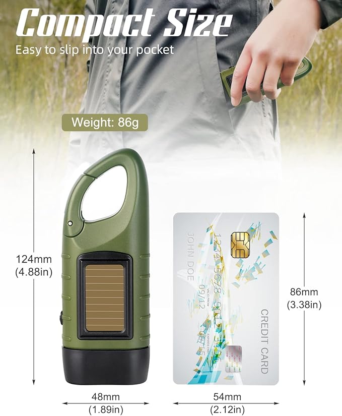 - Real Compact & Convenient Carabiner: This emergency flashlight is small enough even for a little girl’s hand. Size: 124 x 48 x 32mm. Weight: 86g. Perfect for being carried for trips, takes almost no space of your bag. Plus, thoughtful carabiner allows you to clip it securely outside your backpack, belt or keychain, enhancing mobility while letting the flashlight being charged by the sun during outdoor activities.