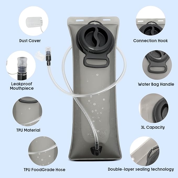 - Upgrade Leakproof Water Bladder: Our water storage uses military-grade double sealing technology making it completely pressure-proof and leak-proof. An upgraded anti-leak pad is added to the opening, which perfectly solves the leakage problem