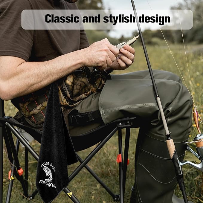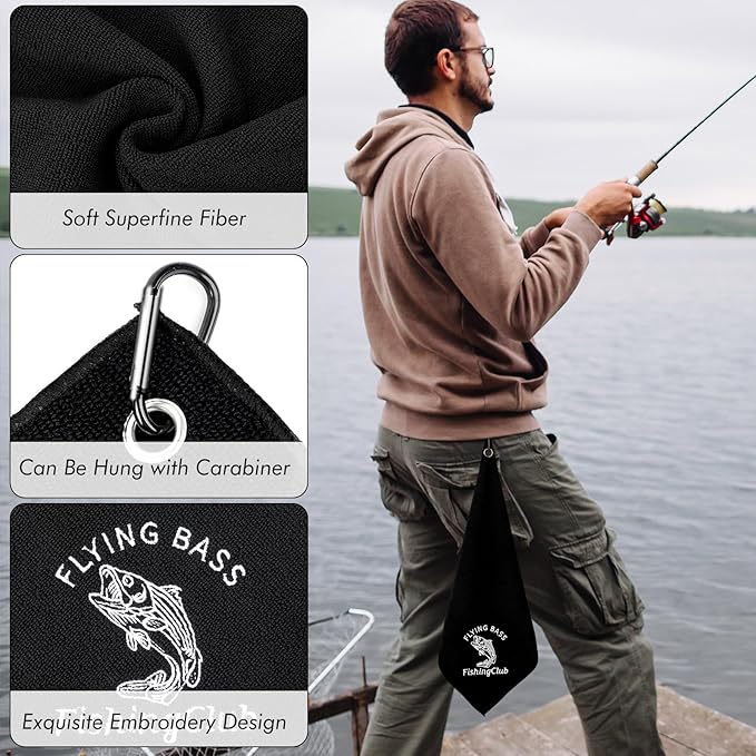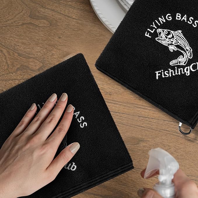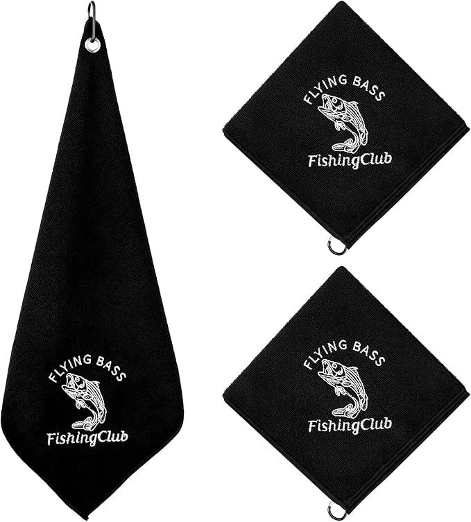 - 4.Classic design: This fishing towels with clip set features 'FLYING BASS Fishing Club' embroidery and white fish pattern. The colors and designs of the camping towels are classic yet fashionable and can complement any color of your clothes and equipment. Enough quantity for you to replace and share this golf towel with friends who like outdoor sports.