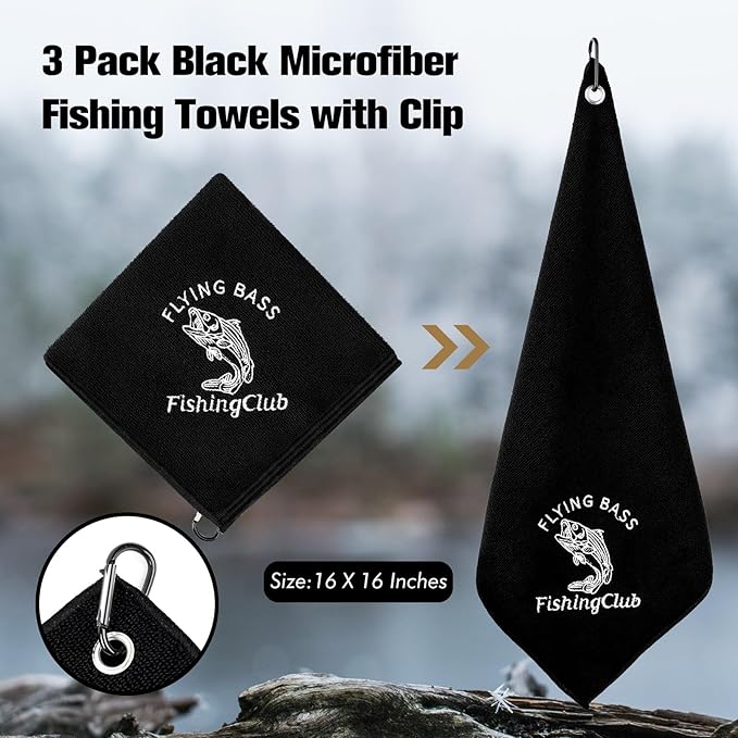 3 Pack Microfiber Fishing Towels with Clip 16’ x 16’ Camping Towel Black Hiking Towels Boat Towels Bait Towel Golf Towel For Man Women Camper Club Effective Cleaning of Fishing Gears Dirty Hands Body