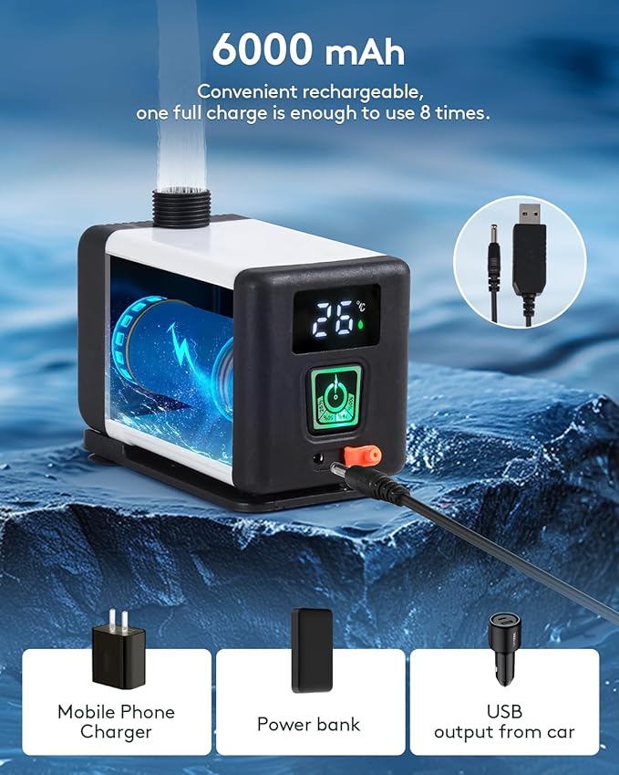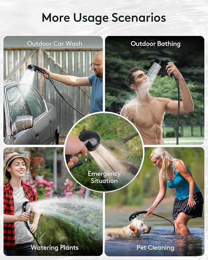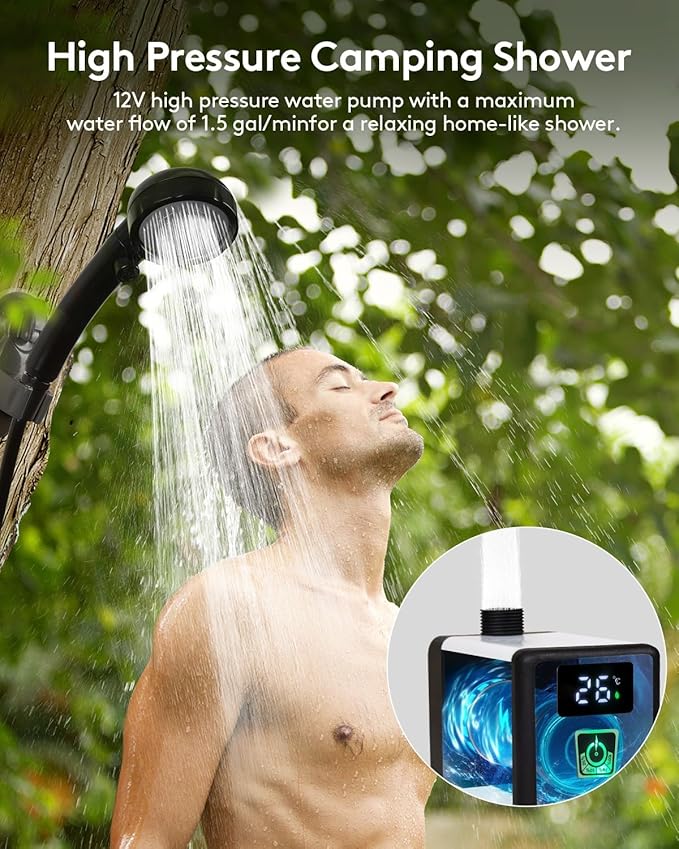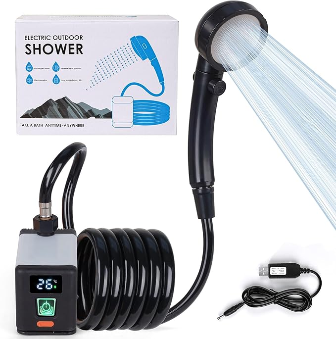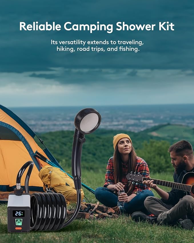 - OUTDOOR LONG-LASTING WORK & EASY CHARGING - 6000mAh ensures extra-long use, one full charge can last for 8 showers. At the same time, you can recharge via the power bank and car port. Its versatility extends to travelling, hiking, road trips and fishing, ensuring reliable performance wherever you go.