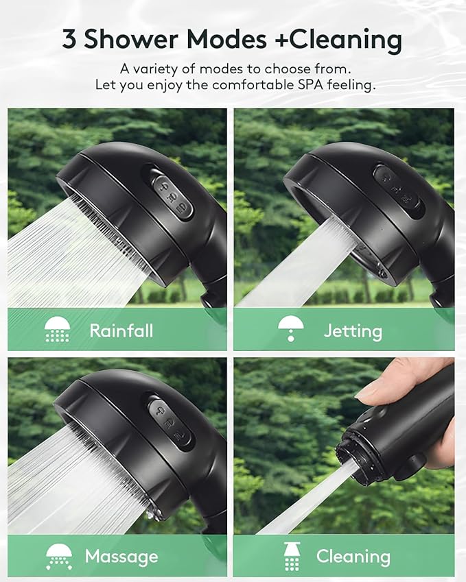 - MULTI-MODE SPRAY - The high pressure shower head has four convenient spray settings: Rain, Spray, Massage and Clean. The one-touch pause button is easy to use.